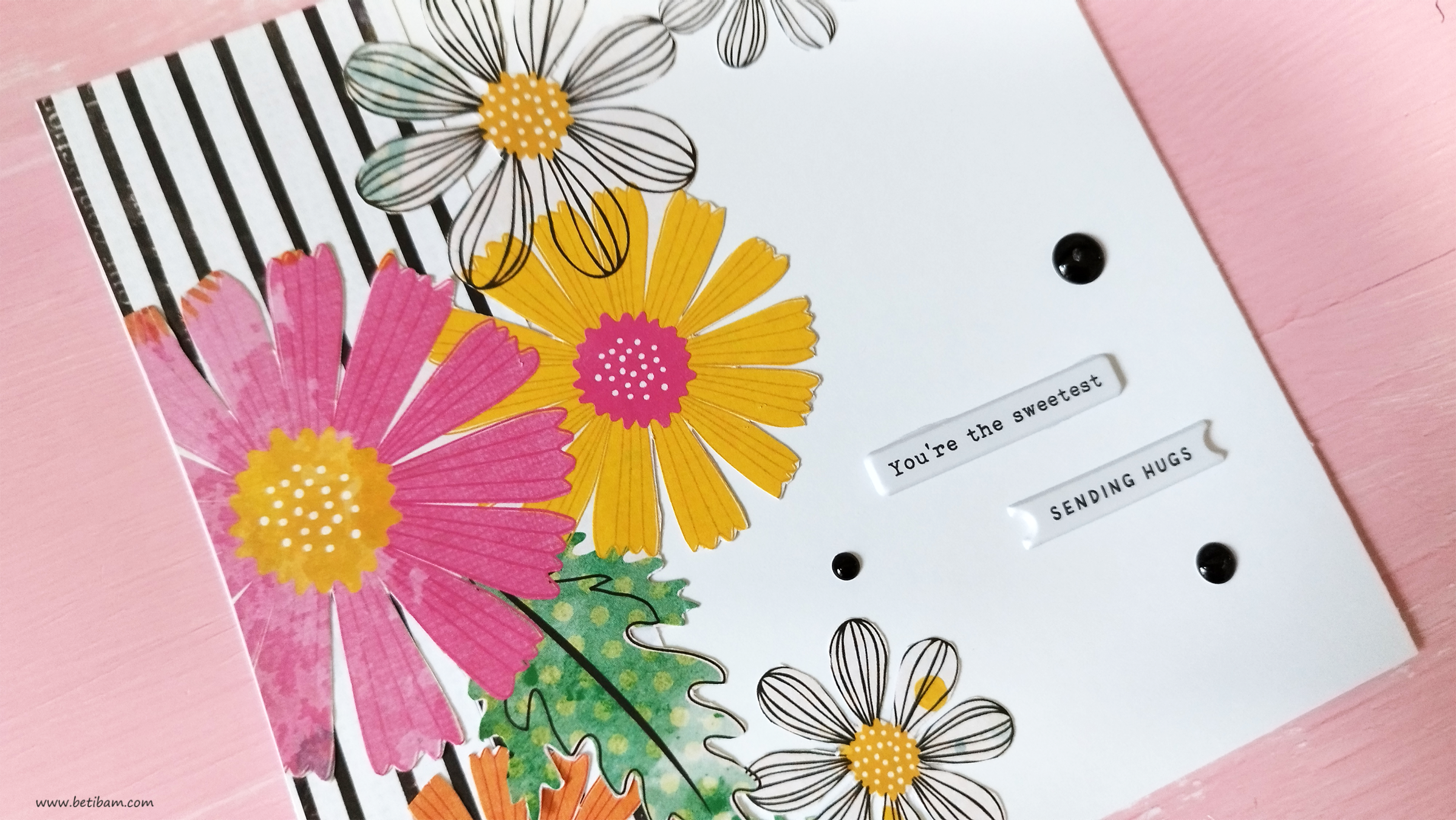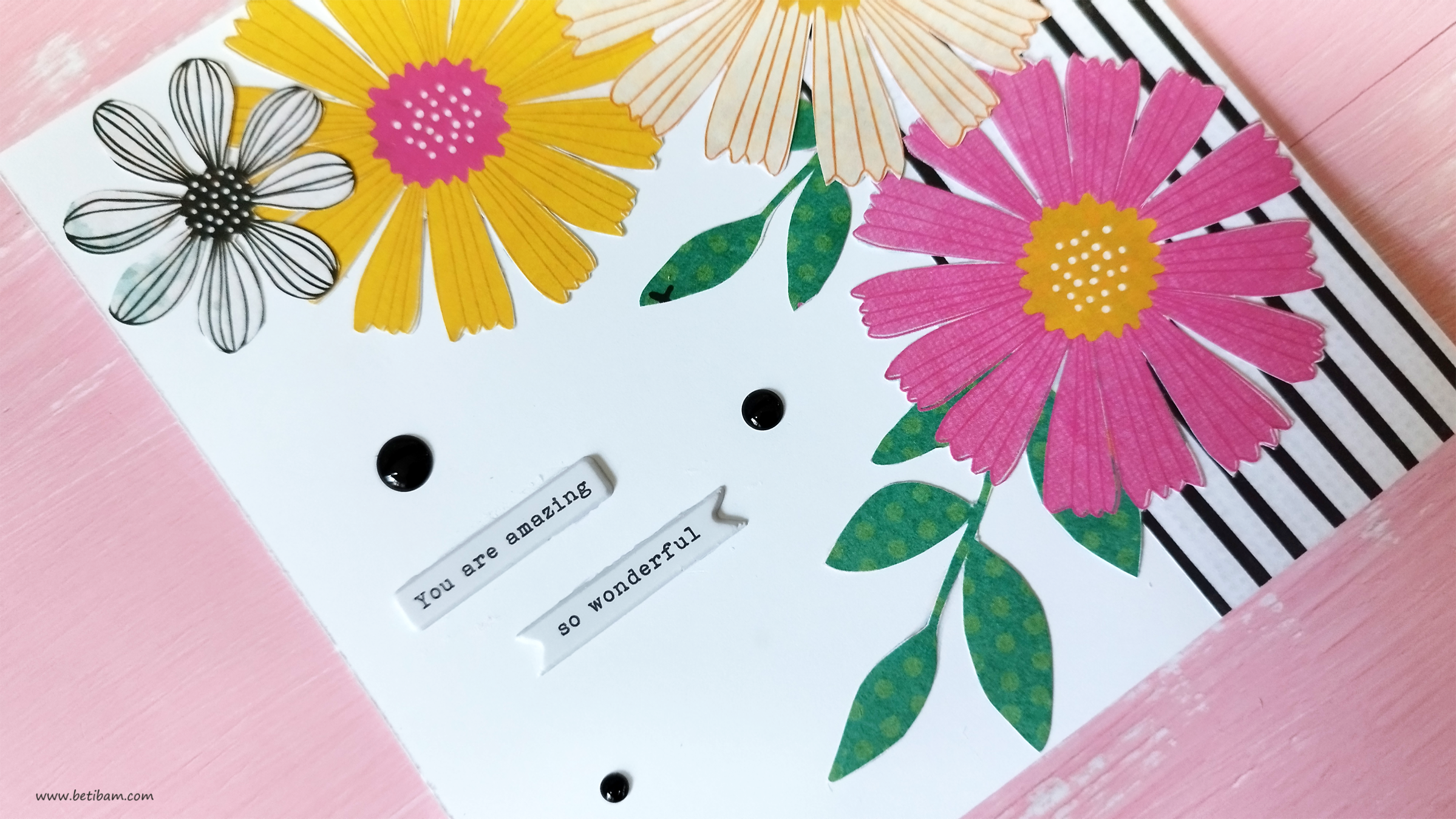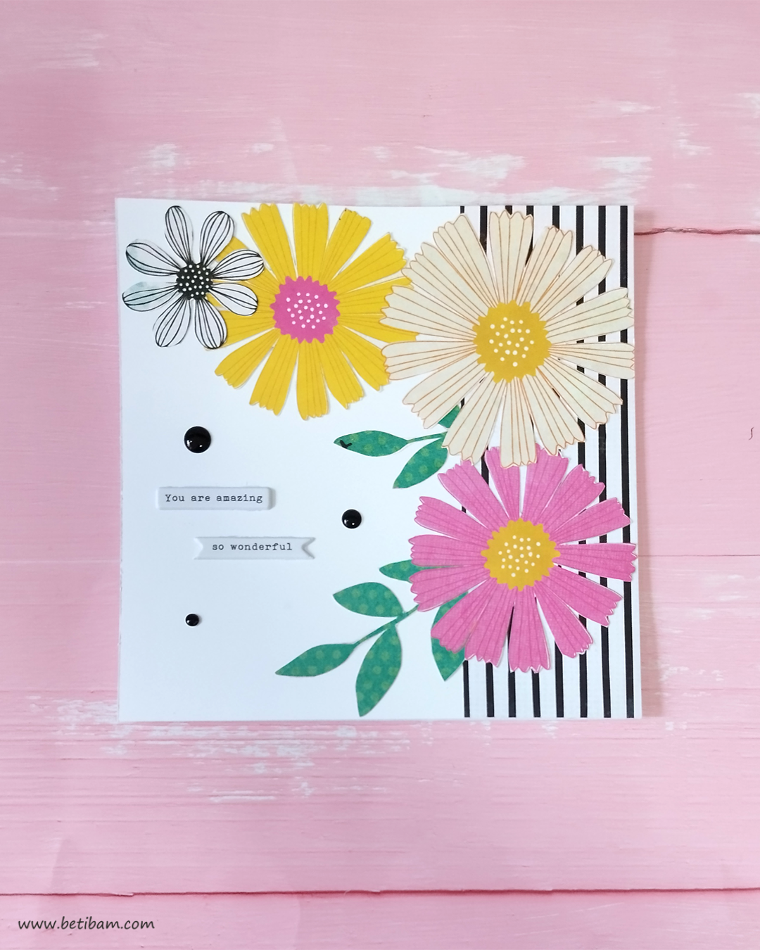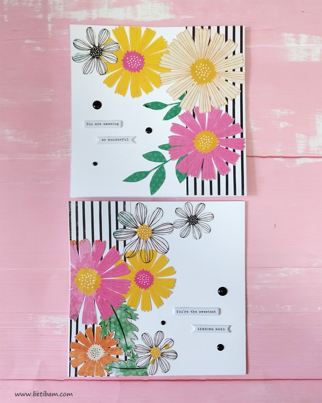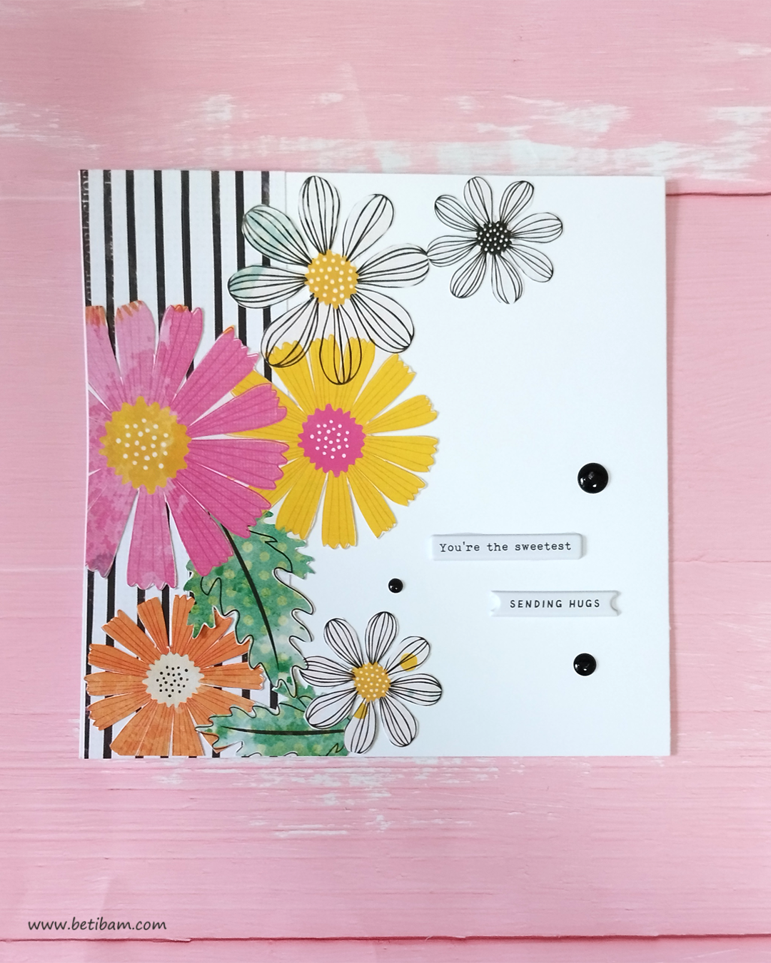השתמשתי גם בעיצובי הפרחים מצד אחד של הקארדסטוק וגם בפסים שחור לבן שמופיעים בצד השני של הקארדסטוק.