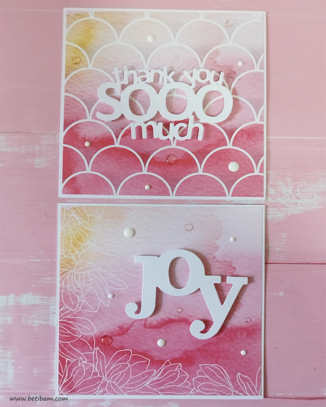 אז היום הכנתי זוג כרטיסים בסגנון נקי ורגוע, בשילוב של רקעי צבעי מים בגווני ורוד וצהוב עם עיטורים עדינים בלבן עליהם.