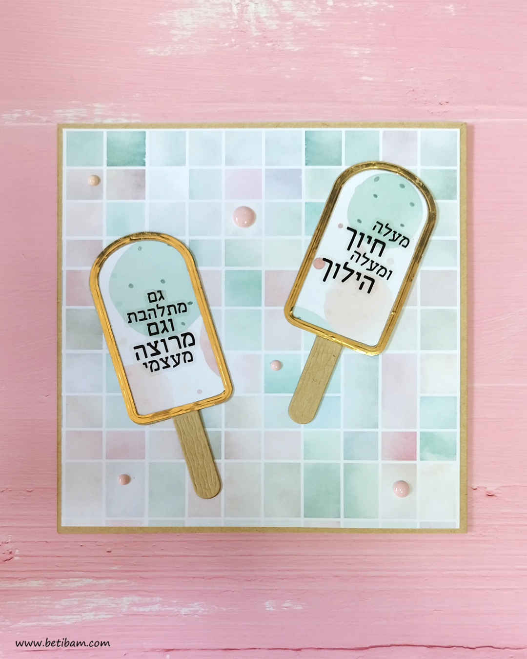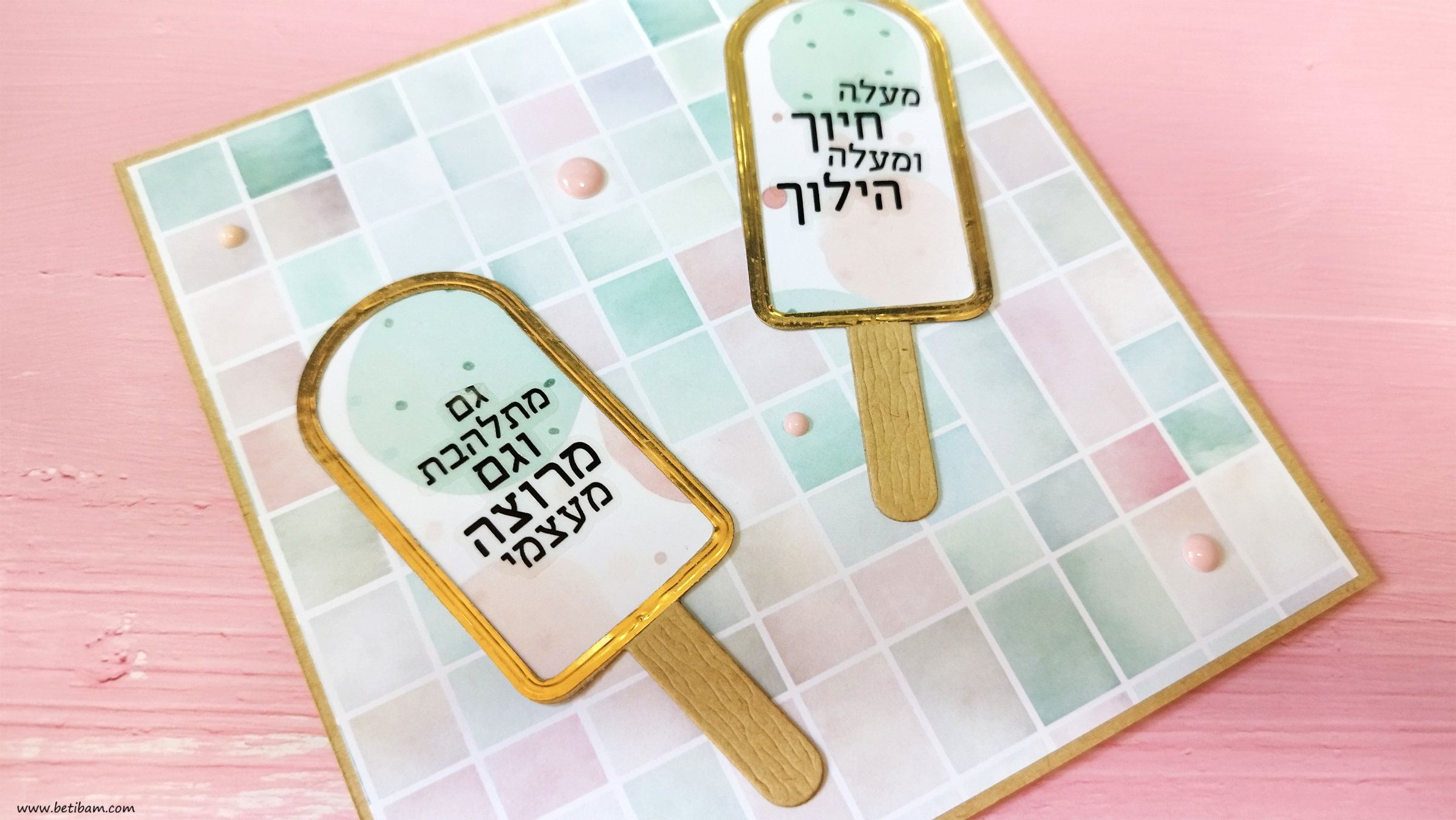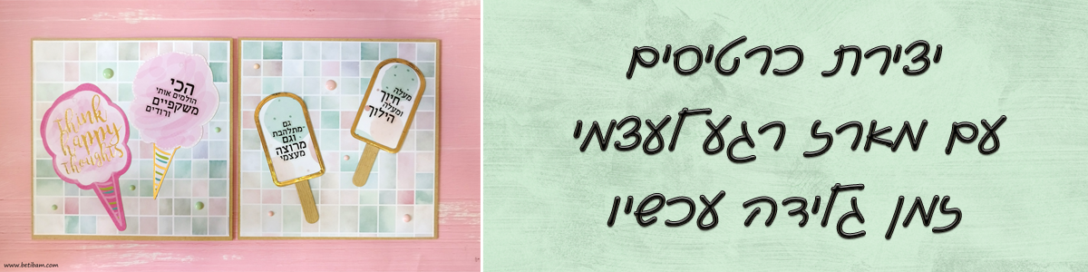 את הגלידות לקחתי ממארז תגיות שיש לי באוסף, הן היו מושלמות בצבעוניות שלהן, הוספתי לתגית הורודה בהירה מסגרת עם עט לבן.