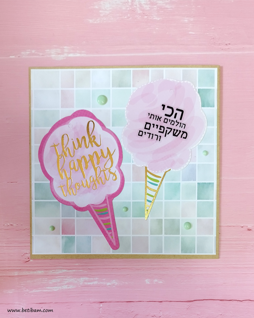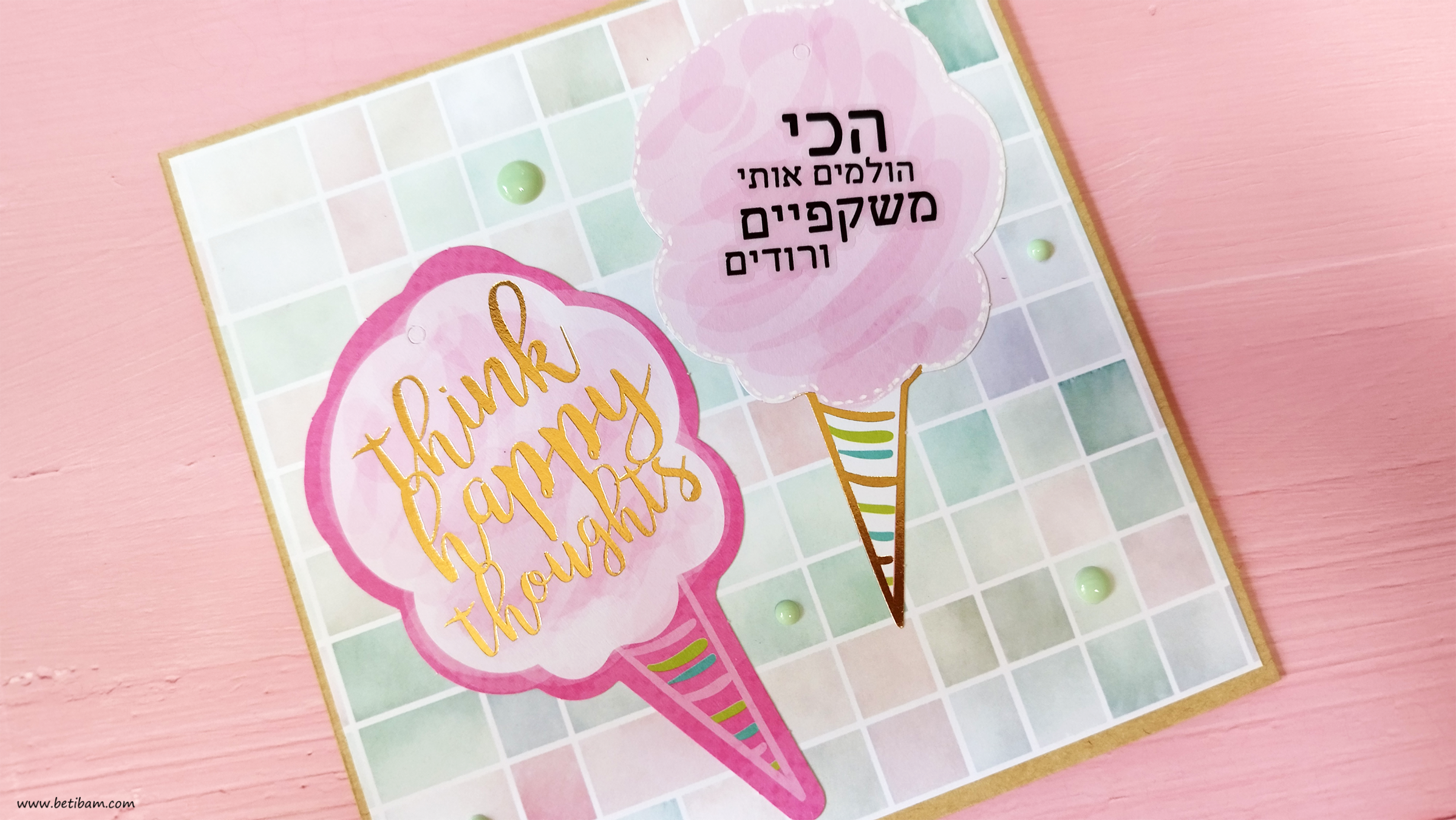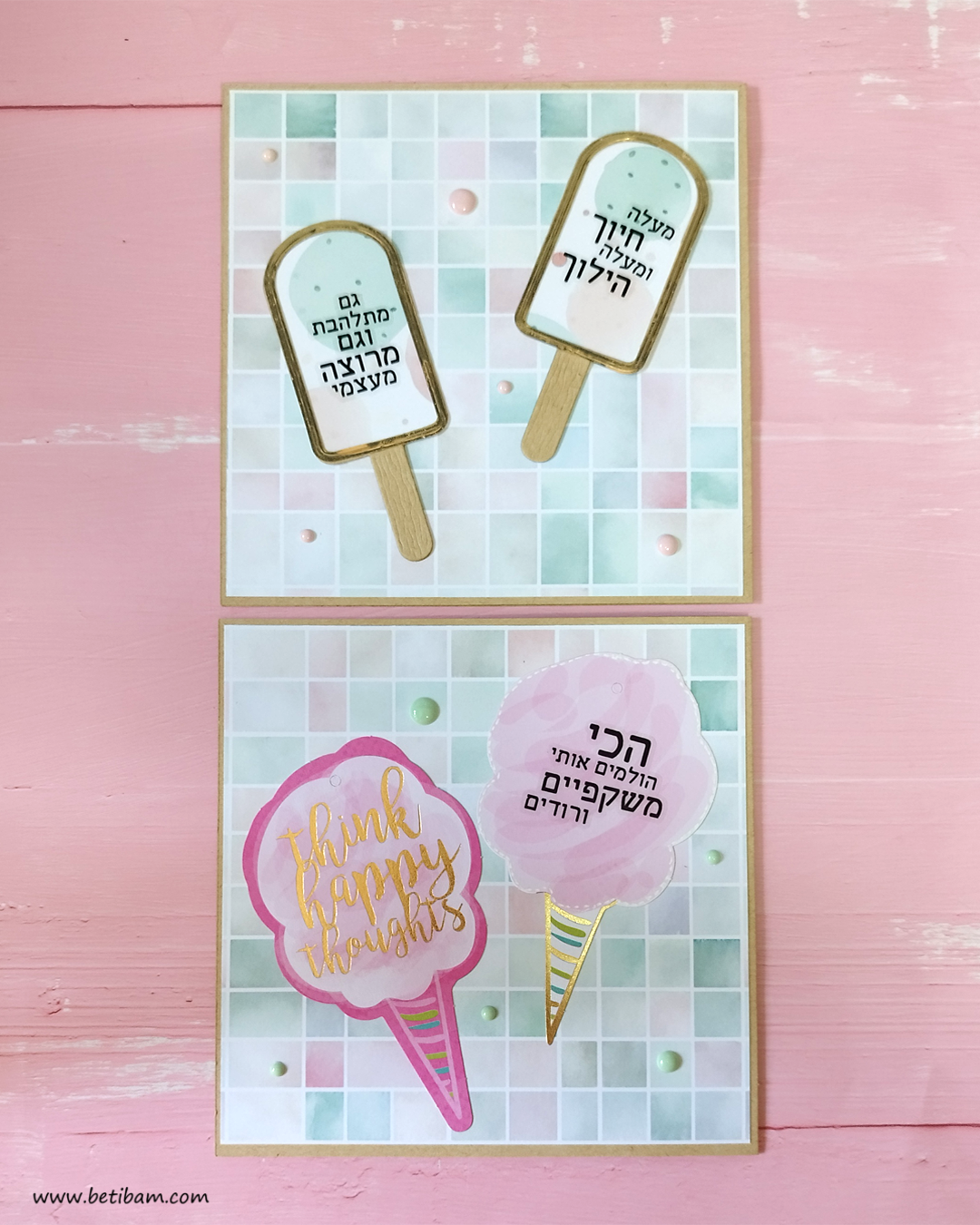 את הגלידות לקחתי ממארז תגיות שיש לי באוסף, הן היו מושלמות בצבעוניות שלהן, הוספתי לתגית הורודה בהירה מסגרת עם עט לבן.