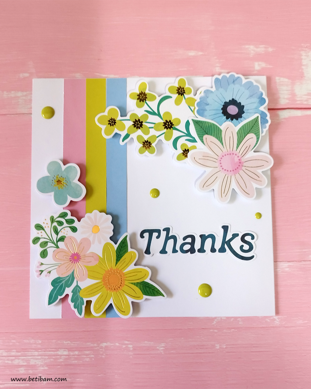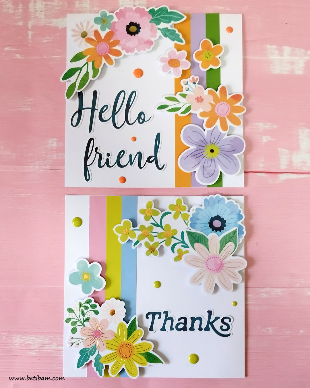 היום כהתחלה בחרתי להכין איתם 2 כרטיסים כיפיים, מודה שקשה לי עדיין לגעת בדפים כי הם ממש יפים ואני רוצה לשמור אותם לאיזה פרויקט של מיני אלבום או משהו בסגנון, אתם לא מבינים כמה שהם יפים 😂 אז חתכתי רק כמה רצועות מהקארדסטוקים החלקים, שילבתי איתם כמה חיתוכים פרחוניים, הוספתי מדבקות מילים וקצת נקודות דביקות.